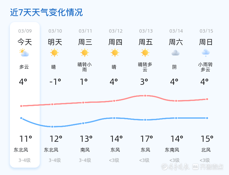 未来三天,枣庄市天气趋势为晴转小雨,气温逐渐上升,最高气温可达13℃,最低气温为-1℃。11日有小雨天气,市民需注意防雨防寒,适时携带雨具。12日天气转晴,气温有所回升,风力减弱。