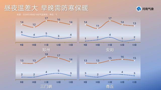 然而,升温并不意味着可以立刻换上春装。昼夜温差,是未来几天天气最需要关注的重点。我省大部分地区最低气温仍在4-6℃之间,昼夜温差普遍超过10℃。以省会郑州为例,未来五天最大温差可达13℃。这意味着,清晨和傍晚时分寒意依然显著,厚衣服暂时还不能收起来。