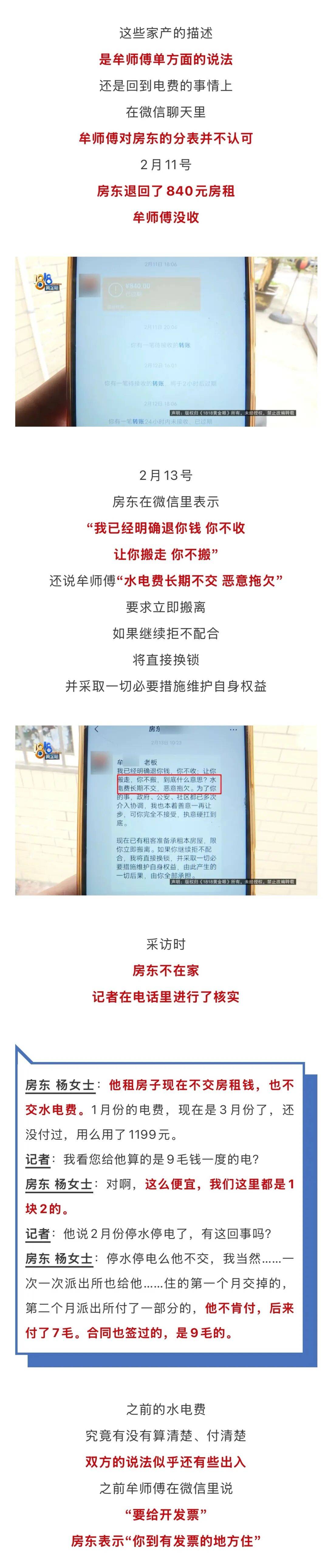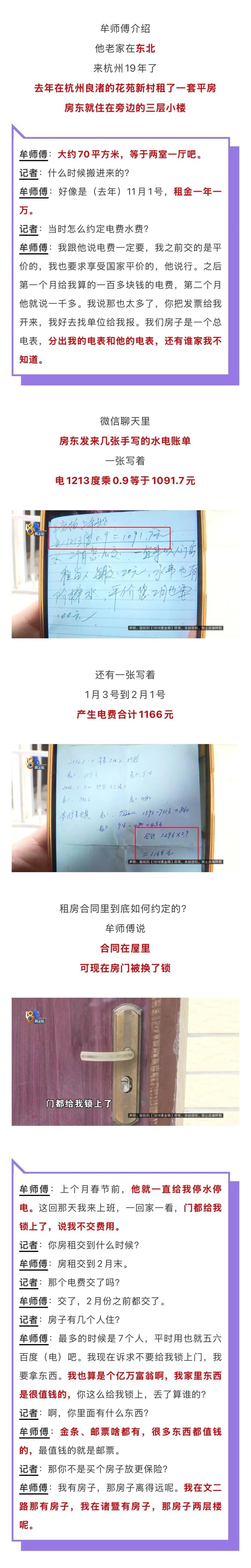 房东 杨女士的丈夫:你要电力局发票,你还要给我开票资料呢,对不对?如果这样的话,我们这里是没有人租给他的。第二点,他到处找我麻烦,知道吧,制造麻烦。我们要在派出所见证之下谈。