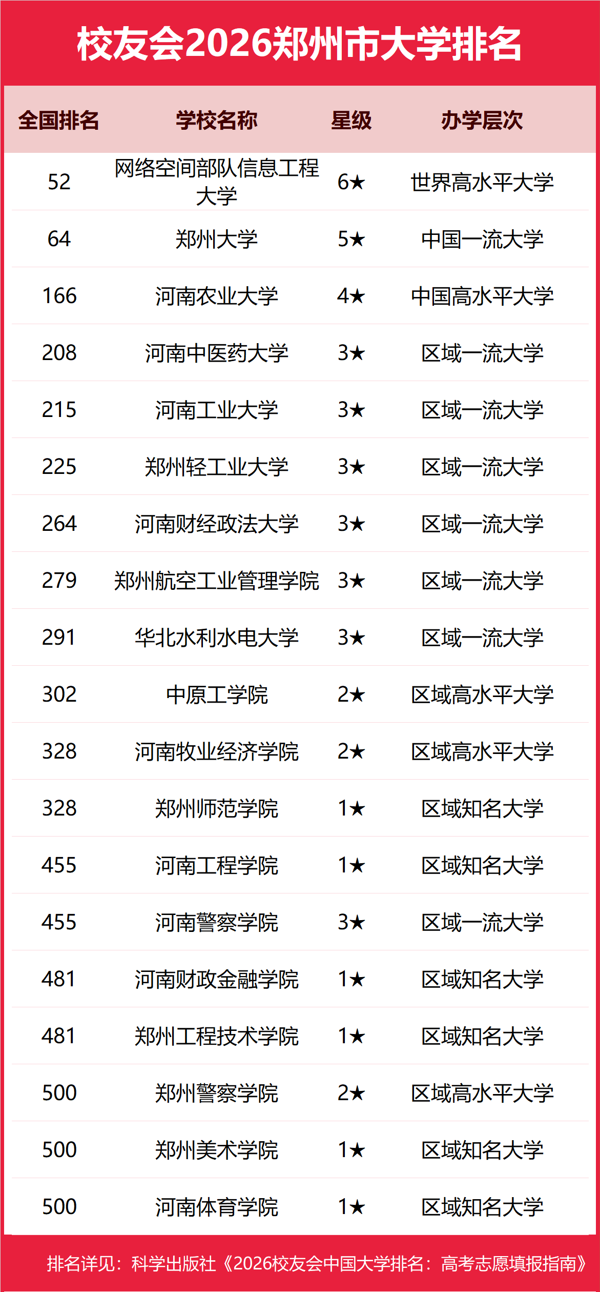 校友会2026郑州市大学排名,网络空间部队信息工程大学第一,郑州大学、河南农业大学前三