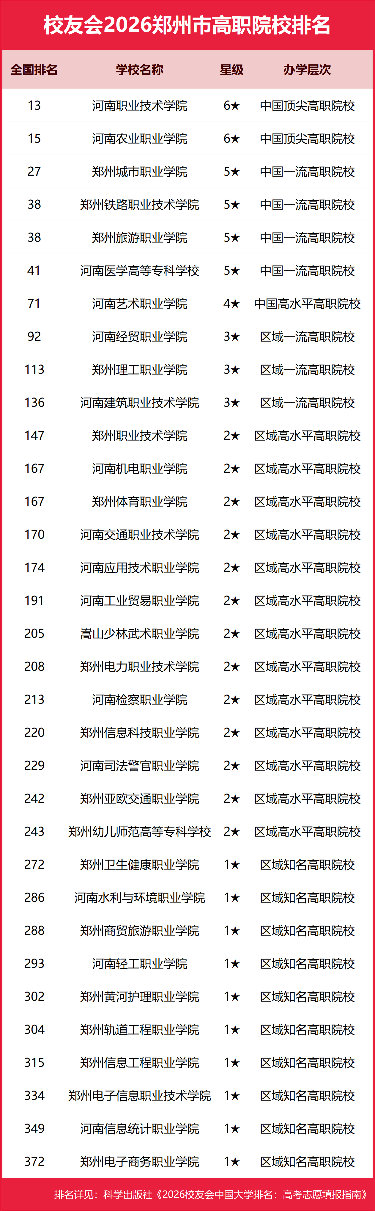 校友会2026郑州市高职院校排名,河南职业技术学院第一,河南农业职业学院、郑州城市职业学院前三