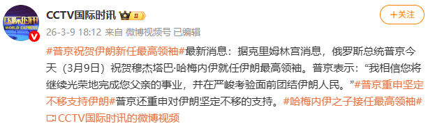 据CCTV国际时讯消息,据克里姆林宫消息,俄罗斯总统普京今天(3月9日)祝贺穆杰塔巴·哈梅内伊就任伊朗最高领袖。普京表示:“我相信您将继续光荣地完成您父亲的事业,并在严峻考验面前团结伊朗人民。”普京还重申对伊朗坚定不移的支持。
