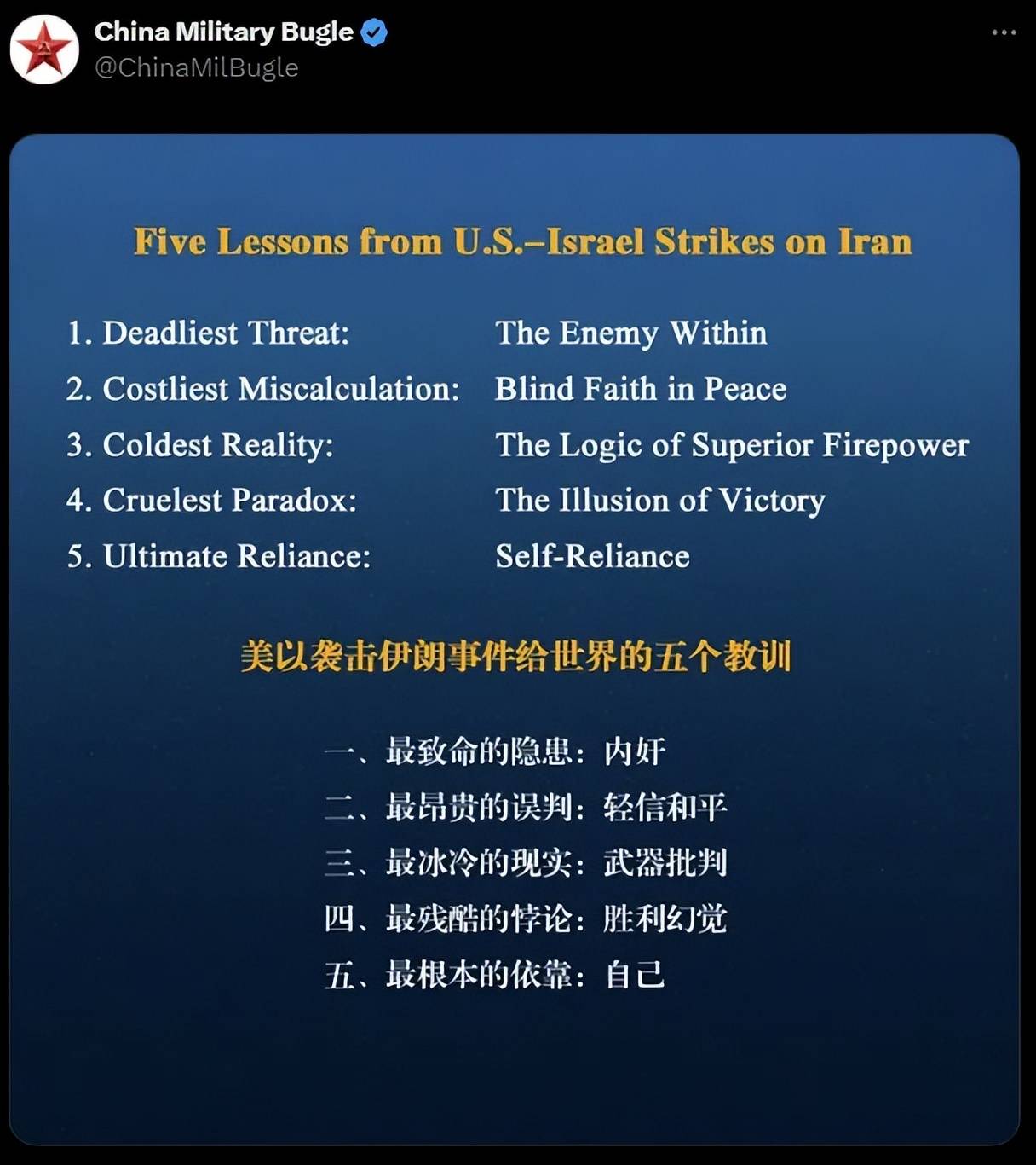 ▲中国军号所发布关于此次战争的五个教训,《中国军号》是解放军新闻传播中心主办的官方媒体