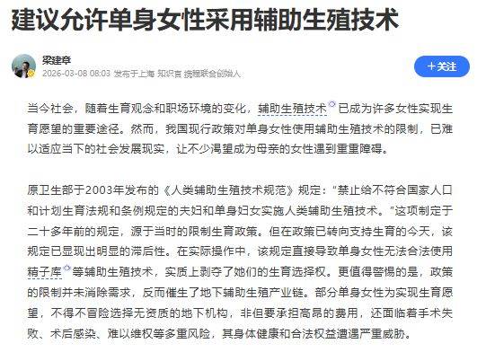 在文中,梁建章提到:“我们建议允许单身女性采用辅助生殖技术,这既是对女性生育权的尊重,也是适应生育支持政策、构建生育友好型社会的必然要求。”