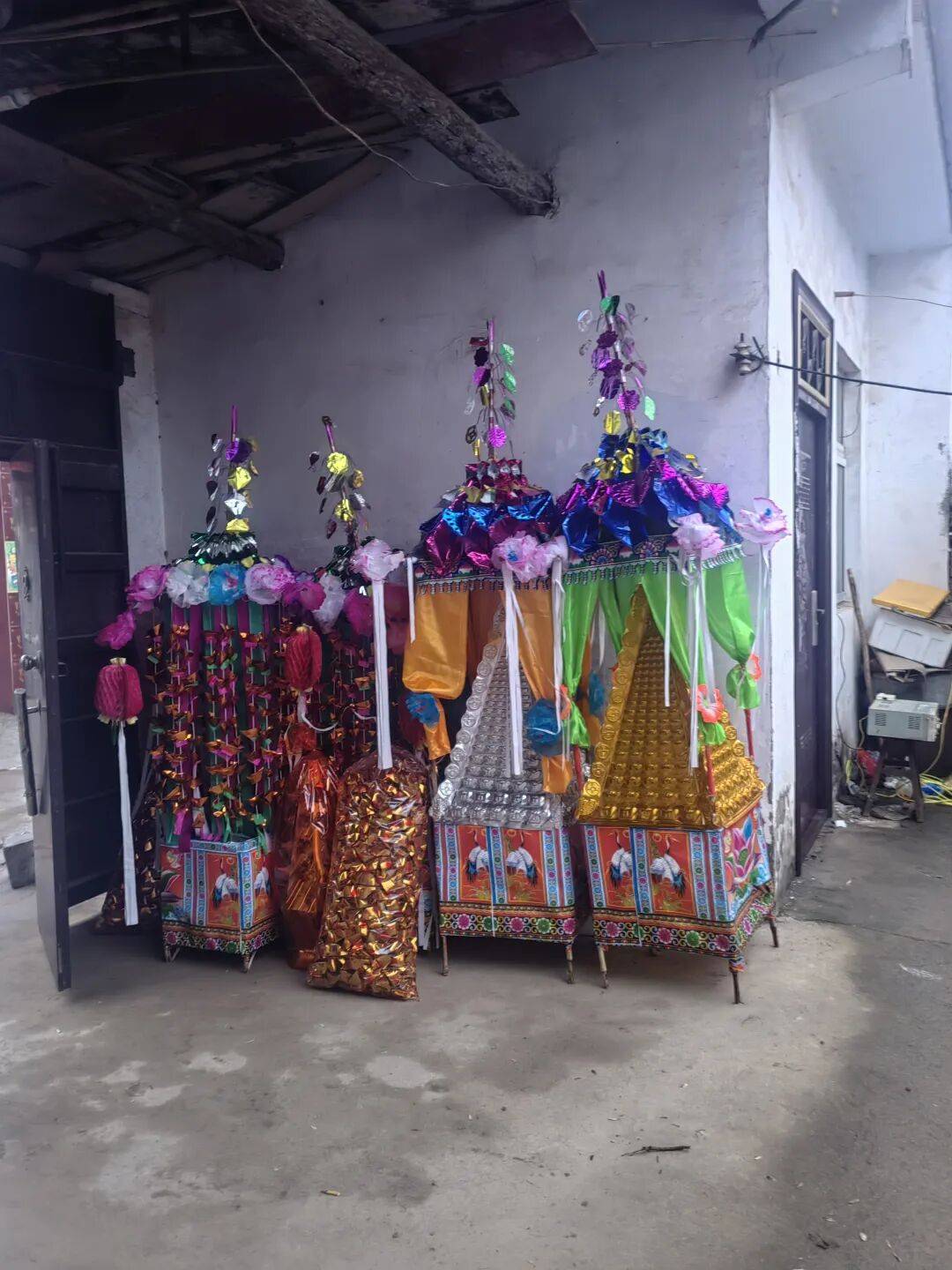 前头走着吹唢呐和笙的人,还有电子炮车,而后是第一个供桌,跟着我哥一行人,以及帮忙拿摇钱树纸扎等物品的人,最后是第二个供桌结尾。