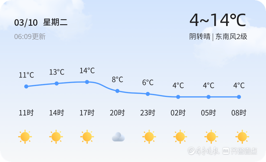 今天是3月10日,正月廿二,星期二。德州今日天气阴转晴,气温4℃至14℃,东南风2级,空气湿度73%。当前空气质量为轻度污染,PM2.5浓度为111微克/立方米,建议敏感人群减少户外活动。市民出行时请注意防晒和保暖,随身携带雨具以防天气突变。