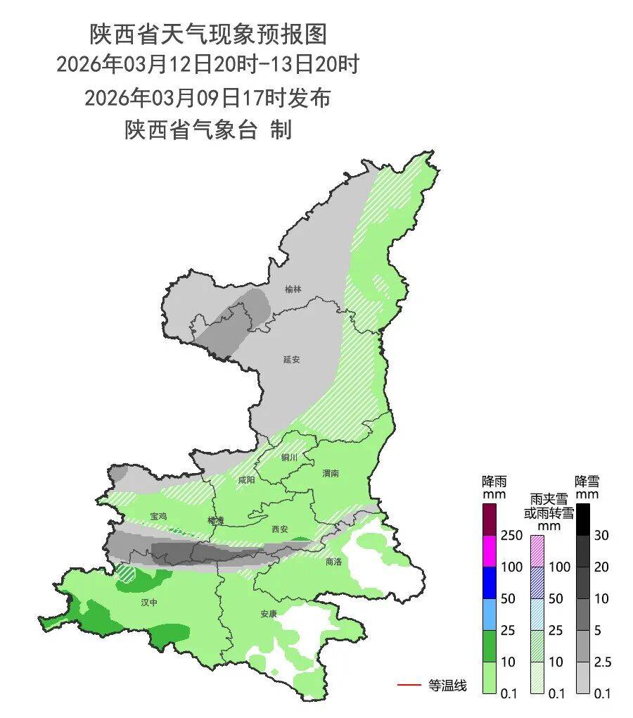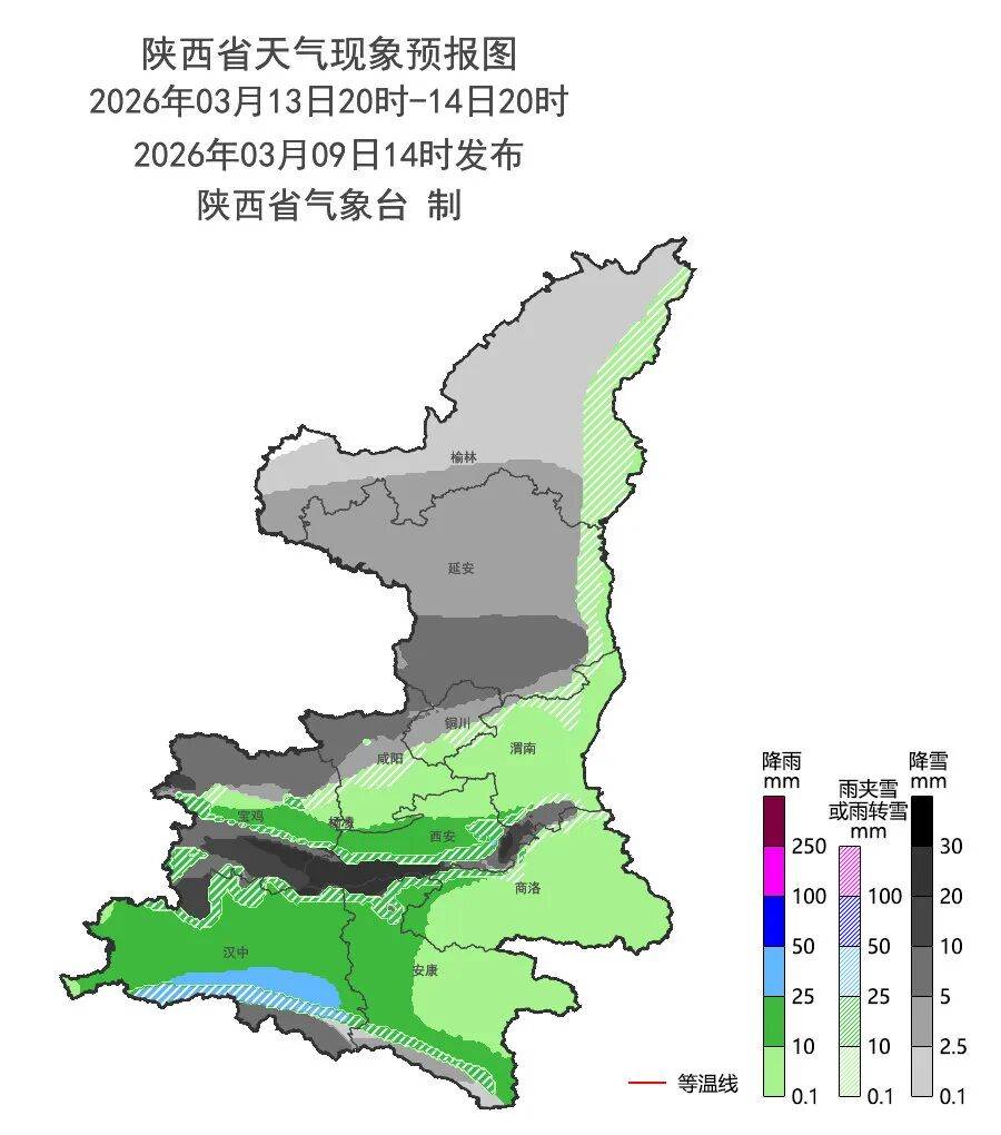 3月13日:陕北中西部、关中西北部小雨转雨夹雪或小到中雪(0~5毫米),秦岭山区小到中雪(0~3毫米)、局地大雪(5~10毫米),陕北东部部分、关中中东部、陕南大部有小雨(0~8毫米)、陕南西部局地中雨(10~20毫米)。