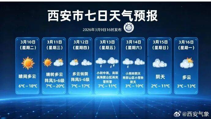 预计西安市明后以晴到多云天气为主,最高气温17~20℃。13-14日西安市有一次雨雪、降温及吹风天气,主要降水时段在13日白天至14日白天,全市以小到中雨为主,南部高海拔山区雨夹雪转雪,最高气温下降至10℃左右。