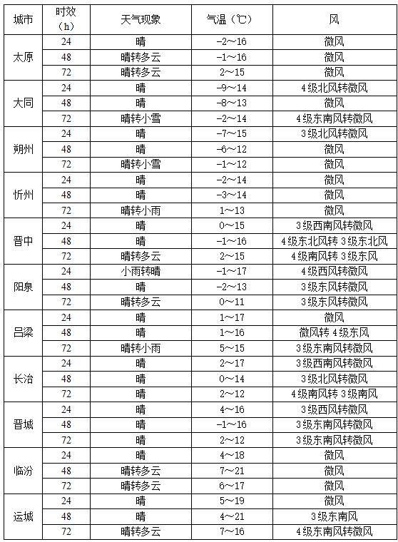 - 天气:西部晴天间多云;东部多云转晴,大同、忻州、阳泉、晋中、长治局部有小雨或雨夹雪。