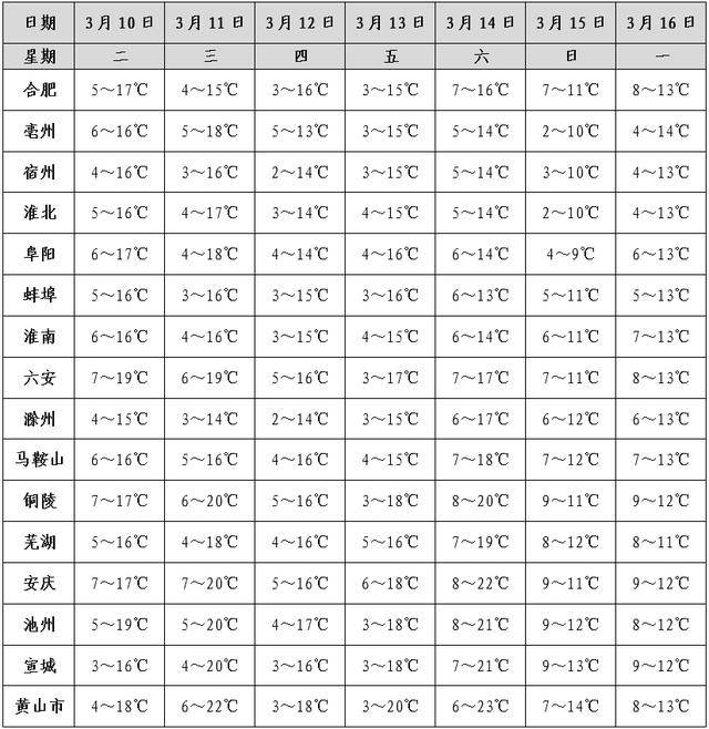 未来十天,合肥市11日、15-19日有降雨,其他时段以多云到晴天为主;最高气温16~19℃,最低气温3~6℃。