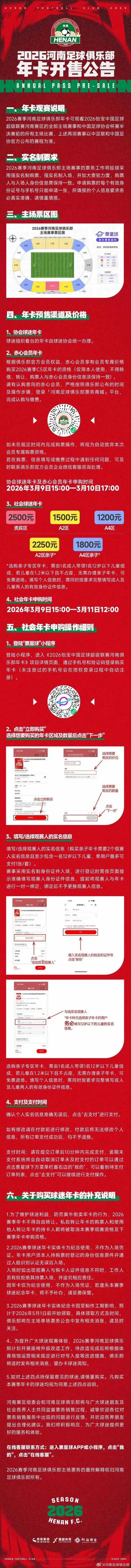 价格分别为1200元(A4区)、1500元(A2区)、1800元(A4区亲子)、2250元(A2区亲子)、2500元(贵宾区)。申购时间3月9日15:00-3月11日12:00。社会球迷年卡覆盖普通看台到贵宾区域,俱乐部同时为家庭球迷设置亲子年卡,满足不同球迷的观赛需求,让更多人可以以家庭为单位走进球场,陪伴河南队走完整个赛季。