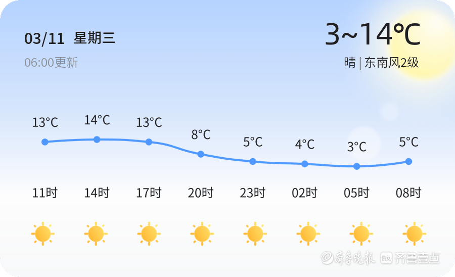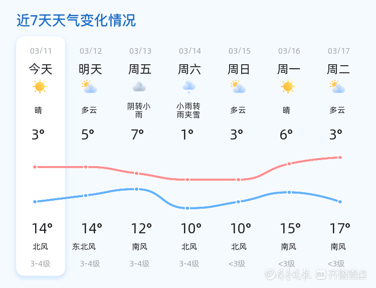 今天是3月11日,星期三,农历正月廿三。济南市迎来晴朗天气,气温适宜,全市各区普遍以晴天为主。今日最高气温14℃,最低气温3℃,当前温度为8.7℃,东南风2级,空气湿度75%,PM2.5指数为129,空气质量轻度污染。市民在享受晴好天气的同时,建议敏感人群注意防护,减少外出。明天天气转为多云,气温与今日持平,最高气温14℃,最低气温5℃。风力稍有增强,风向由东南风转为东北风,风力3-4级。明天的天气总体平稳,市民可以正常安排户外活动,但需注意防范大风天气带来的不便。未来三天,济南市天气将呈现阴雨相间的变化。周三天气为阴转小雨,气温7℃至12℃;周四小雨转雨夹雪,气温进一步下降至1℃至10℃;周五天气转为多云,气温回升至3℃至10℃。建议市民根据天气变化及时增添衣物,雨雪天气外出时携带雨具,注意防滑保暖。温馨提示