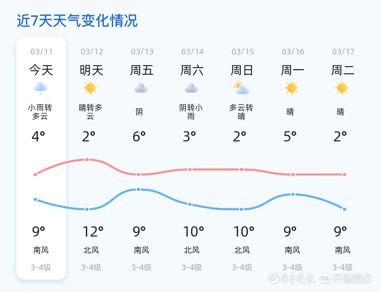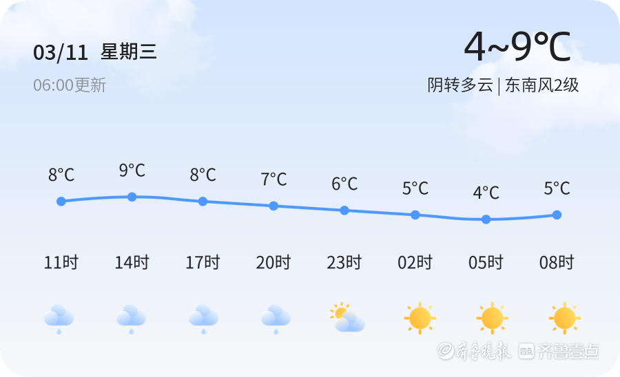 今天是3月11日,星期三,农历正月廿三。青岛市今日天气阴转多云,东南风2级,空气湿度73%,PM2.5指数37。当前温度为6.4℃,白天最高气温9℃,最低气温4℃。各区天气情况总体平稳,以阴转多云为主,风力较小,适宜户外活动。