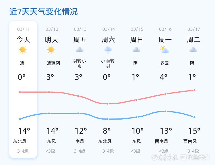 明天3月12日,德州市天气将由晴转阴,气温与今日持平,仍为0℃至14℃,但风力将有所减弱,东风风力小于3级。市民需注意天气变化,适时调整着装。