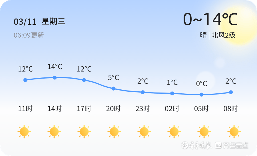 今天是3月11日,星期三,农历正月廿三。德州市迎来了一天的晴好天气,气温介于0℃至14℃之间,北风2级,空气湿度较高,PM2.5浓度为193。全市各区均以晴朗天气为主,适宜市民外出活动。