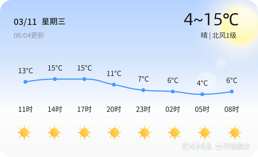 今日是2026年3月11日,星期三,农历正月廿三。济宁市今日天气晴朗,气温范围为4℃至15℃,北风1级,空气湿度82%。空气质量状况为轻度污染,PM2.5指数为114。市民出行时建议佩戴口罩,减少户外长时间活动,尤其敏感人群应注意防护。今日气温适宜,但早晚温差较大,市民需注意保暖,适时增减衣物。未来三天,济宁市天气以晴转多云为主,气温波动不大,最高气温15℃,最低气温4℃。明天3月12日,天气晴转多云,风力3-4级,市民需注意防范大风可能带来的影响。后天3月13日,天气阴,风力3-4级转<3级,建议市民提前做好防范措施。3月14日,将迎来小雨天气,气温有所下降,最低气温3℃,最高气温12℃。市民出行时建议携带雨具,注意交通安全。温馨提示