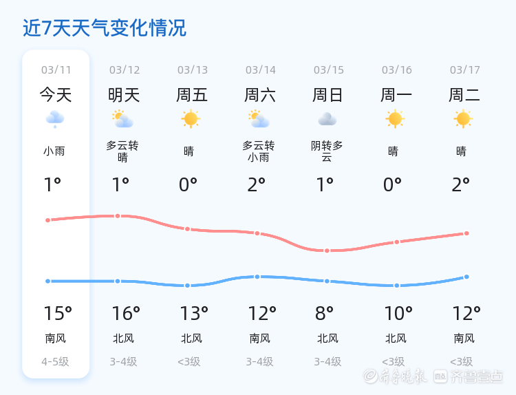 未来三天,泰安市天气趋势为晴好为主,气温逐步上升,预计最高气温可达16℃,最低气温0℃。其中,13日为晴天,气温0℃至13℃,风向北风,风力小于3级;14日多云转小雨,气温2℃至12℃,风向南风,风力3-4级;15日阴转多云,气温1℃至8℃,风向北风,风力3-4级。在此提醒市民,未来三天温差较大,尤其是14日有小雨天气,路面湿滑,市民需注意携带雨具,驾车出行需减速慢行,确保行车安全。