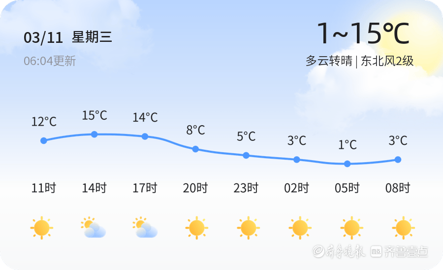 今天是3月11日,星期三,农历正月廿三。泰安市今日天气多云转晴,气温1℃至15℃,东北风2级,空气湿度58%,PM2.5指数127。各区天气情况基本一致,多云转晴,温差较大,市民出行需注意适当增减衣物。预计今日最高气温出现在14时左右,为15℃,最低气温1℃出现在05时。目前温度为9.7℃,天气状况为多云转晴,风向东北,风力2级,空气质量指数为127,处于良好水平,市民外出时建议佩戴口罩,注意防护。各区天气情况如下