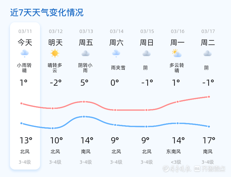 未来三天,潍坊市天气将呈现多变趋势。3月13日,星期五,天气为阴转小雨,气温在5℃到14℃之间;3月14日,星期六,天气为雨夹雪,气温在0℃到9℃之间;3月15日,星期日,天气为阴,气温在-1℃到9℃之间。总体来看,未来三天天气变化较大,市民需根据天气情况适时增减衣物。特别是雨夹雪天气,可能导致道路湿滑,建议市民出行时注意安全。