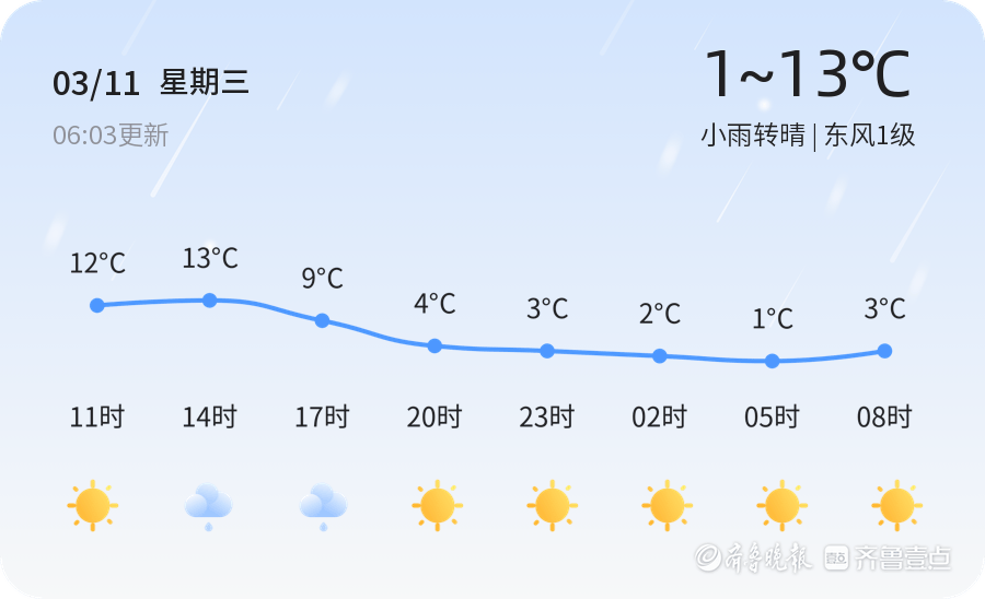 今天是3月11日,星期三,农历正月廿三。潍坊市今天天气为小雨转晴,气温在1℃到13℃之间,东风1级,空气湿度为69%,PM2.5指数为124。各区天气情况基本一致,均为小雨转晴,风力为北风3-4级。目前时间为6时03分,实时气温为5.8℃,天气状况良好,适合市民出行。