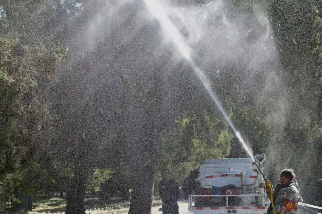 北青报记者在天坛公园看到,园林绿化工人正手握喷头,将清水喷洒向柏树枝头,水雾裹挟着花粉缓缓沉降。洒水车、喷灌设施、高压喷管一齐作业,通过修剪树枝、洒水喷淋、地面湿化等手段,努力降低花粉浓度,减少花粉对市民游客的影响。