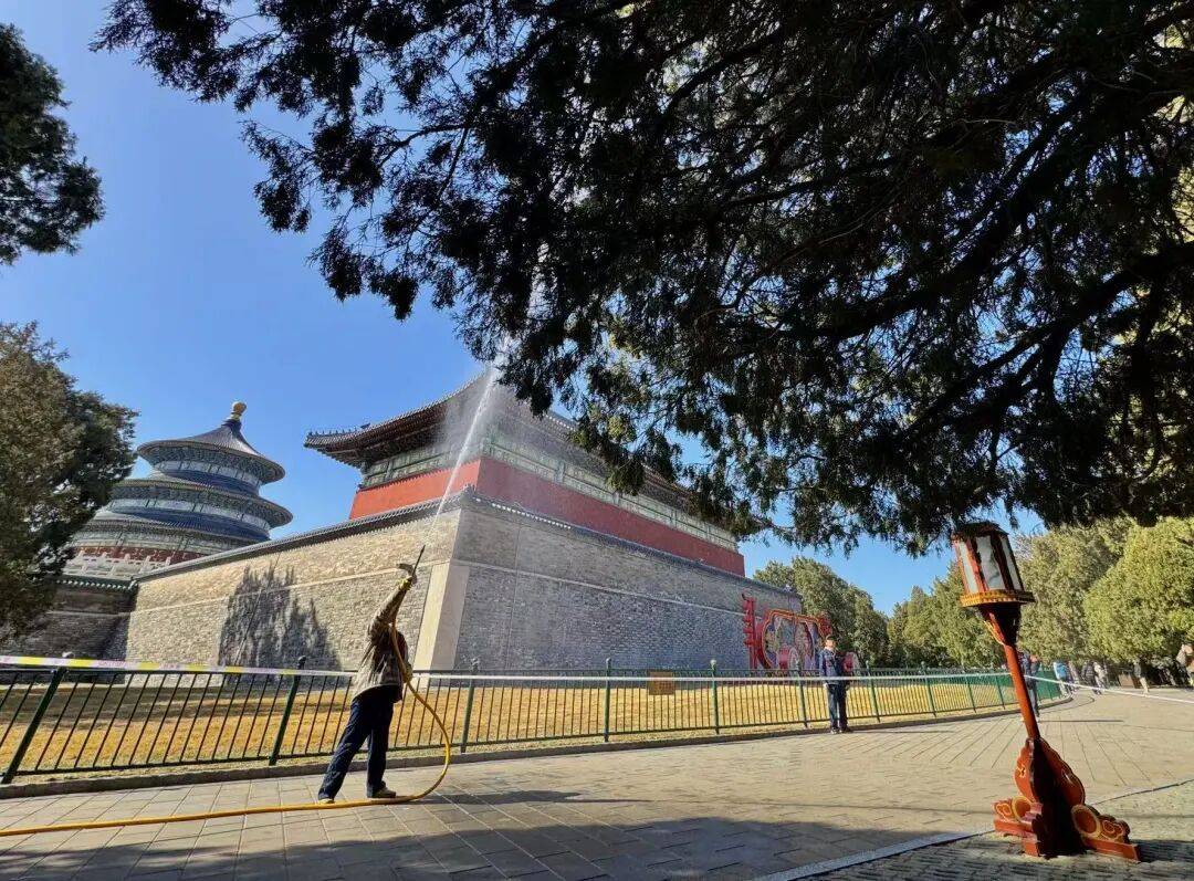 天坛公园将实行错峰精细化作业,在游客量较少、花粉浓度较高的时段,组织绿化队与保洁人员对主干道两侧柏树开展高压清水喷淋,及时冲刷花枝上的花粉;每日开园前、闭园后,强化地面清扫与湿化作业。同时,充分启用草坪微喷系统,提升空气湿度,抑制花粉悬浮扩散。各项作业同步开展游客疏导,播放提示广播,最大程度减少对游园秩序的影响。