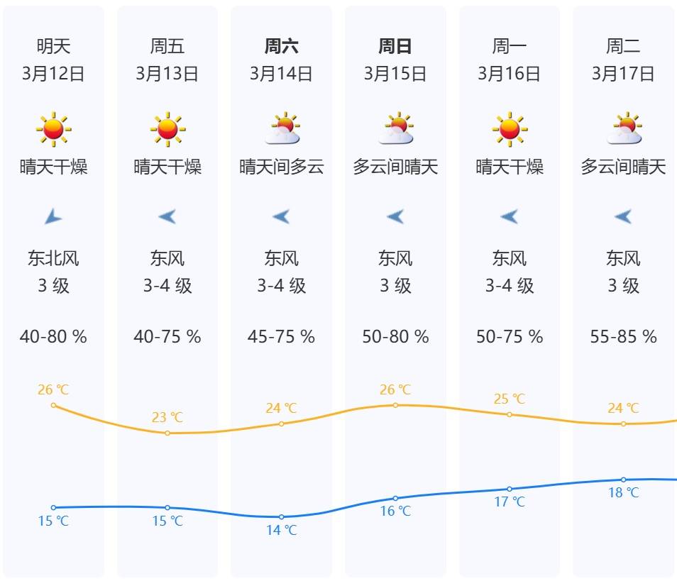3月12日至15日,晴天间多云,空气干燥,气温小幅波动,早晚清凉,昼夜温差加大。其中12日夜间至14日受弱冷空气影响,气温小幅下降,沿海、高地和海区最大阵风7级左右。