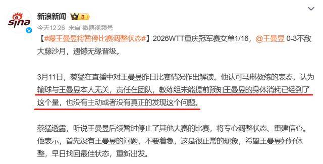 更令人关注的是,蔡猛在直播中透露了一个重磅信息:听说王曼昱后续将暂时停止其他大赛的比赛,专心调整状态、重建信心。这意味着,王曼昱极有可能缺席接下来的一系列重要赛事,包括外界高度关注的澳门世界杯和伦敦世锦赛。尽管蔡猛在节目中反复强调“首先没有王曼昱的问题,不要着急,这是很正常的现象”,并希望王曼昱好好休整、早日找回最佳状态重新出发。