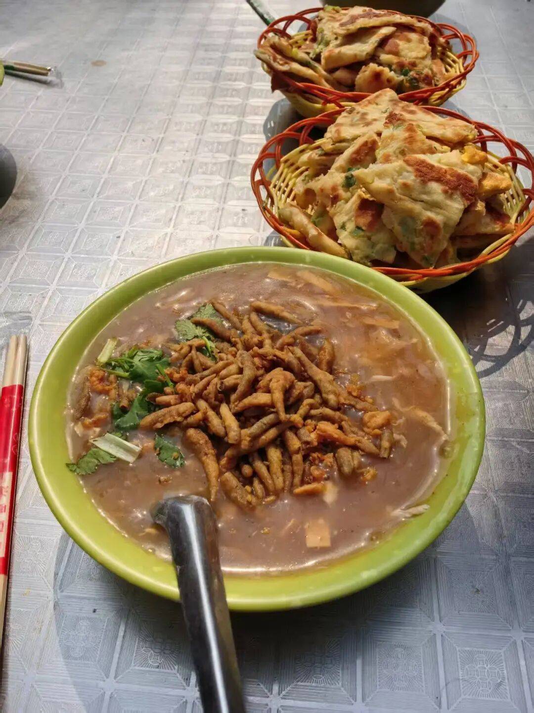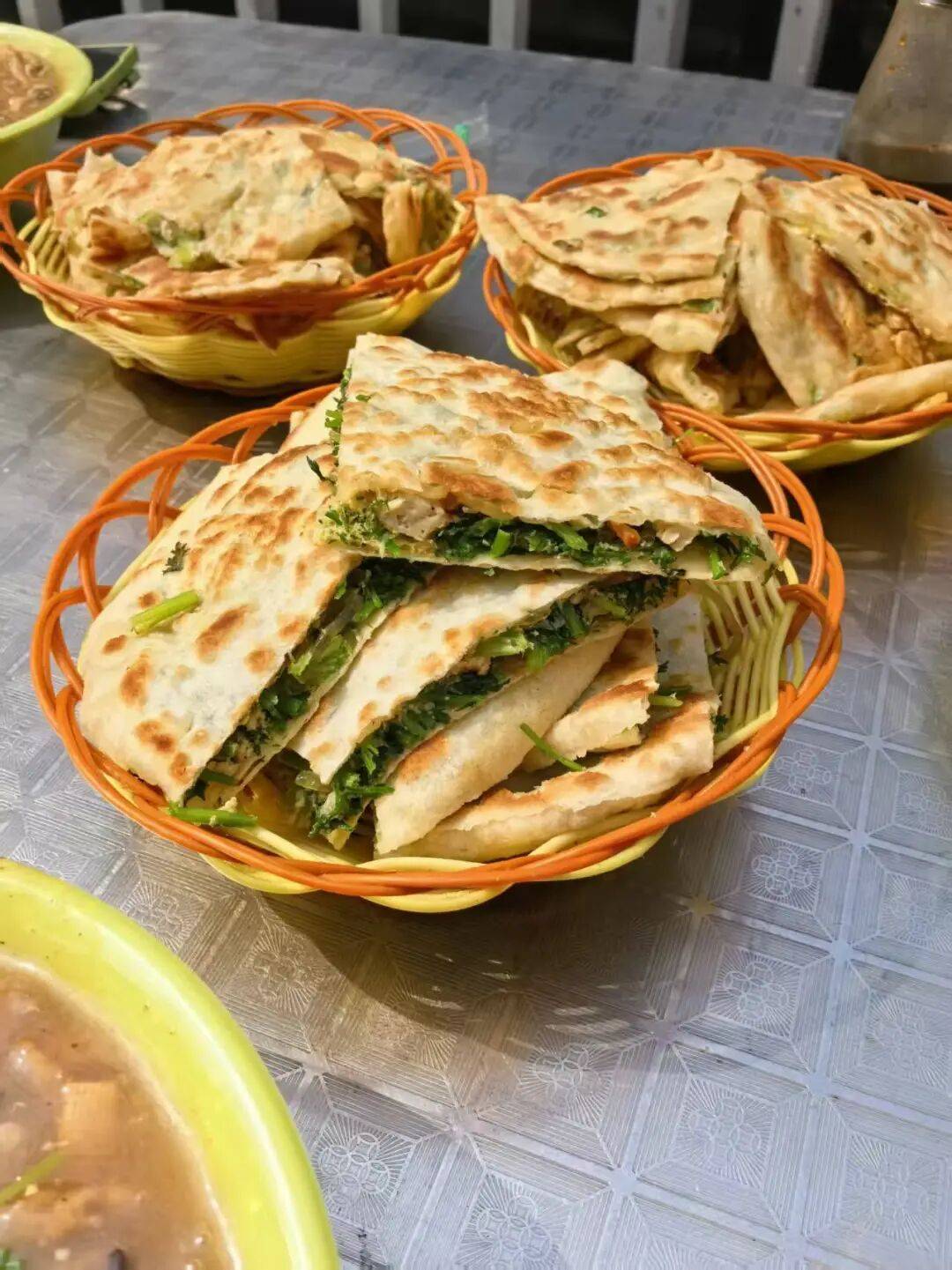 小茴香菜馍,饼皮也很薄,里面满满的菜,盐味很淡,也没有什么复杂的调味料,大概是不想抢了焦鱼汤的风头,搭配很适宜。
