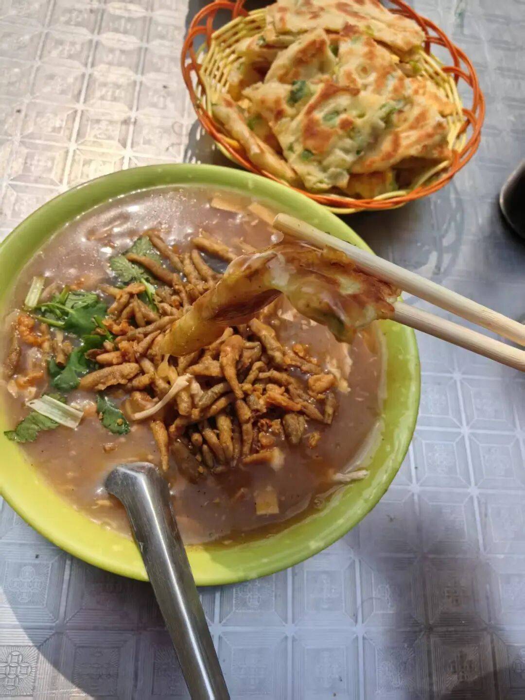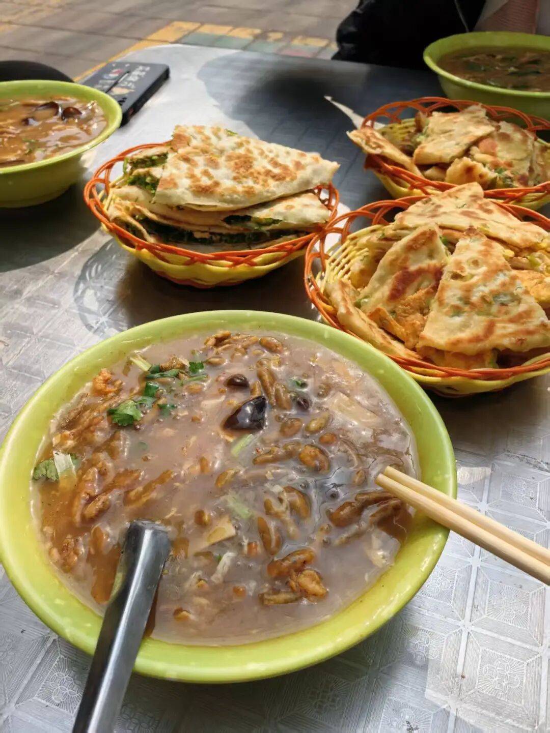 酸辣焦鱼汤,主打焦鱼汤、葱花油馍、菜馍和鸡蛋灌饼。