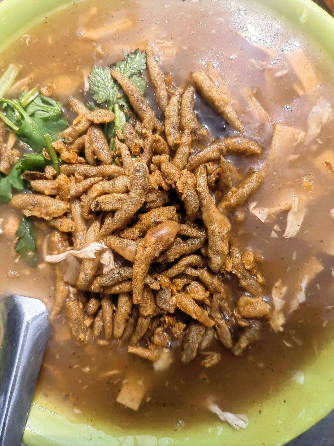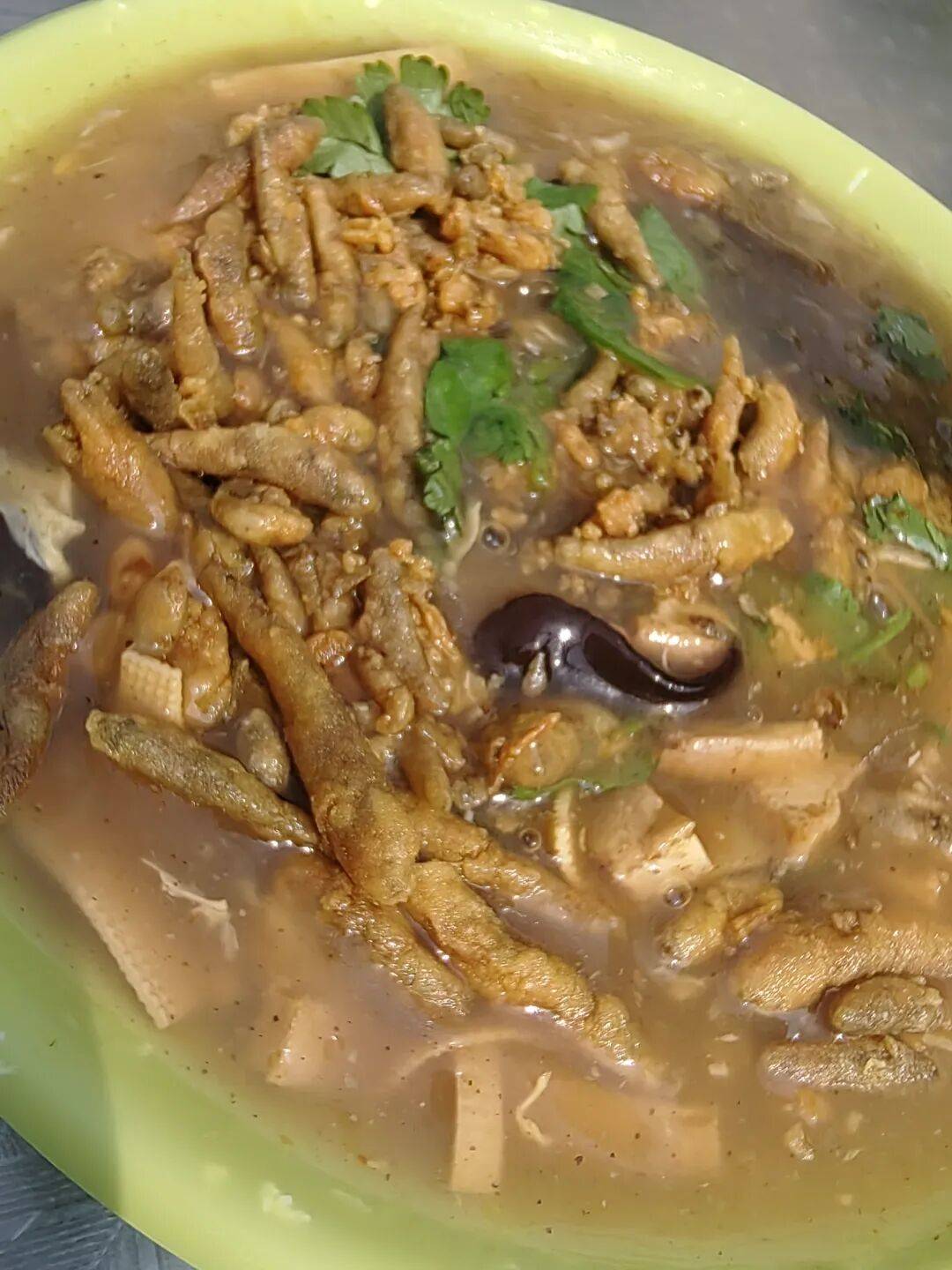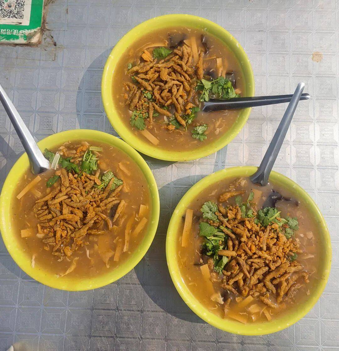 汤里有厚千张、油炸豆腐条、厚豆皮和木耳一类,汤底嘛,以“胡椒味”和“酸味”打底,没有多少辣椒的气息,所以我觉得这个汤底味儿属于比较“浓郁、厚重”一派。
