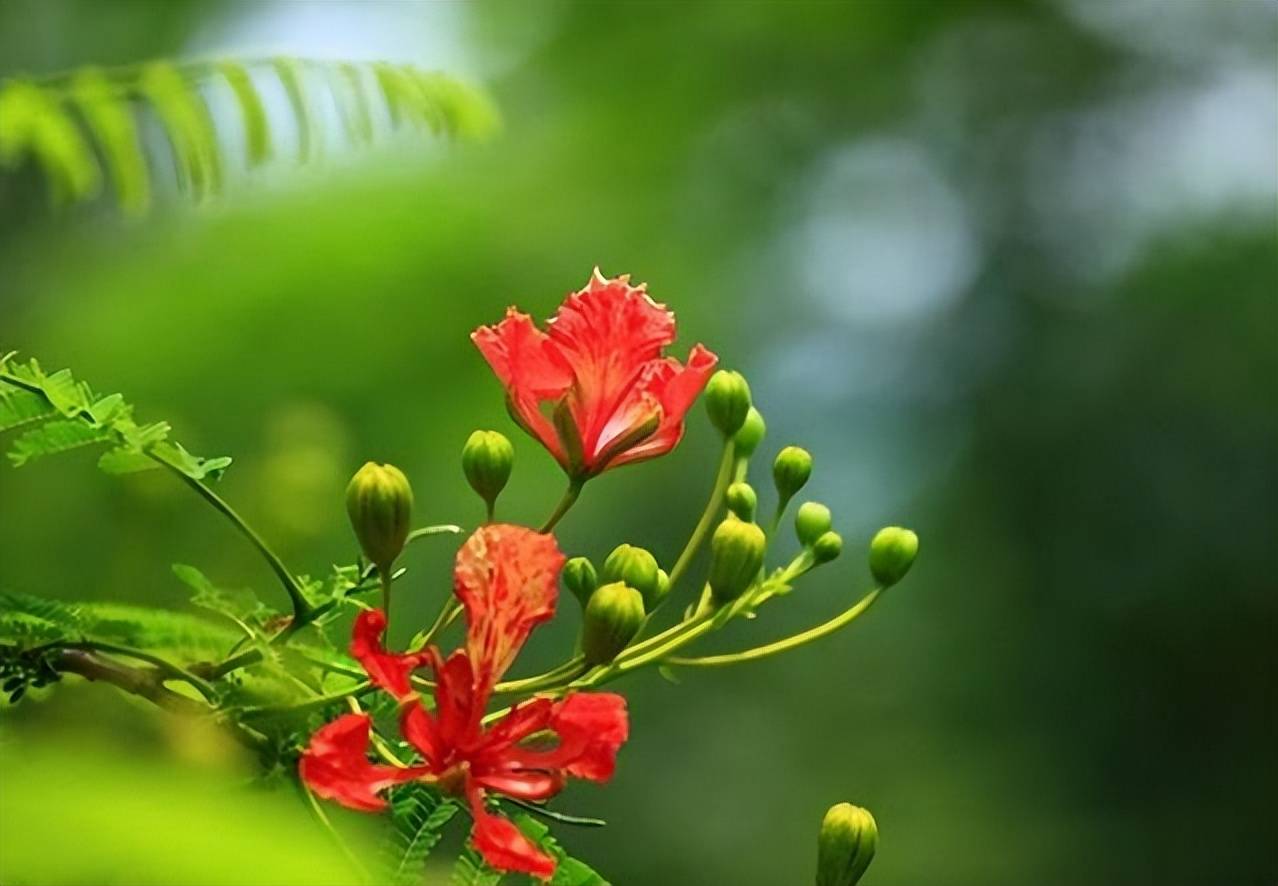 凤凰木的叶子更是别具一格。它的小叶呈长椭圆形,复生的叶子呈现出羽状的形态。每一片小叶都小巧玲珑,翠绿欲滴,仿佛是大自然精心雕琢的艺术品。微风拂过,羽状的叶子轻轻摇曳,发出沙沙的声响,仿佛在诉说着古老的故事。这些青翠的叶子与那一簇簇开得灿烂耀眼的火红花束相互搭配,形成了一幅色彩斑斓的画卷。那火红色的花朵,如同燃烧的火焰,在翠绿的叶子衬托下,显得格外鲜艳壮观。远远望去,整棵凤凰木就像一团燃烧的烈火,在大地上绽放着绚丽的光彩。