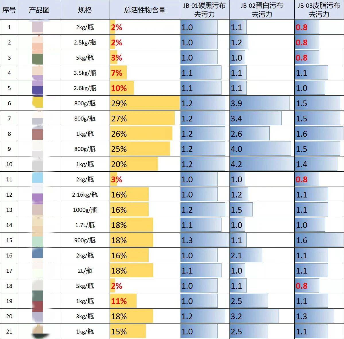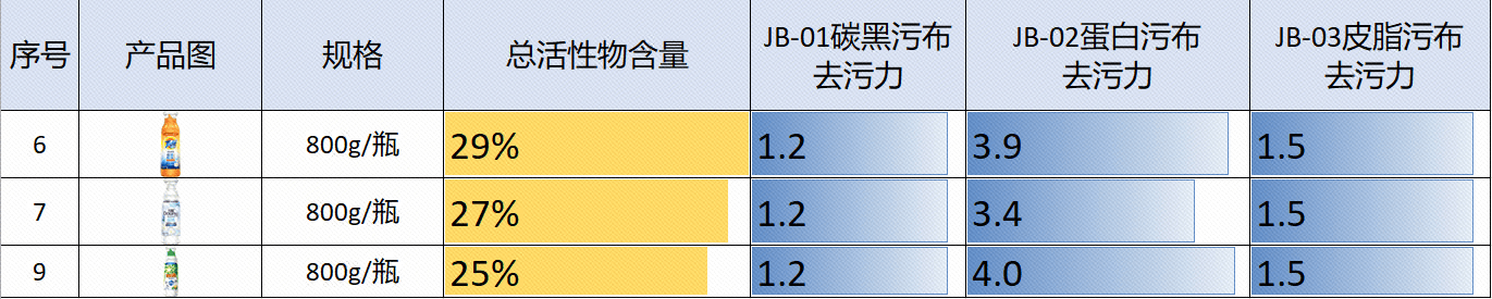 去污力同样两极分化。在对蛋白质类污渍(如血渍、奶渍)的测试中,表现最佳的产品(4.2)与最差的产品(1.0),效果相差超过4倍——相当于“洗一遍和洗四遍的区别”。在对导致领口发黄的皮脂污布去污力测试中,有5款产品数值只有0.8,未达到标准要求,证明其连日常衣物的黄渍、汗渍都洗不干净。