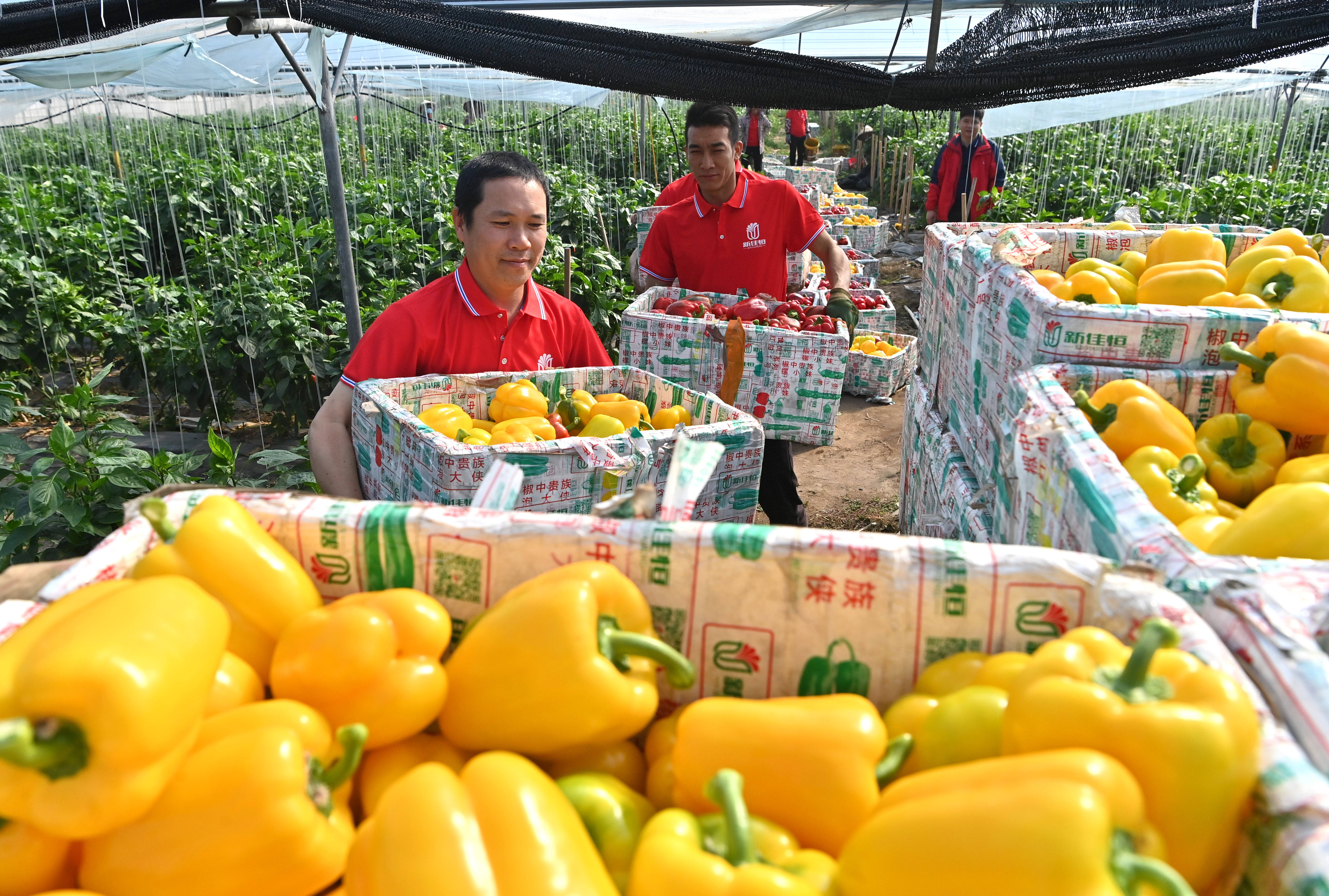 3月12日,工人在广西合浦县沙岗镇北海新佳恒农业技术服务有限公司设施蔬菜种植基地搬运刚采摘的彩椒。 新华社记者 周华 摄