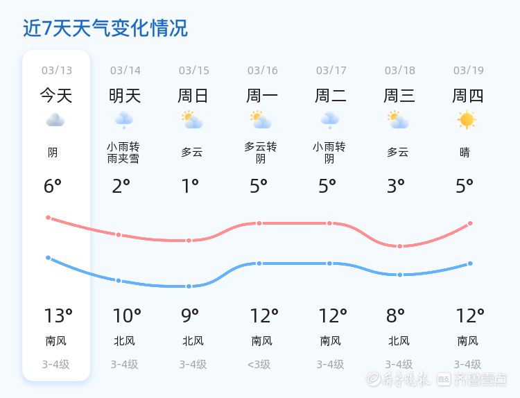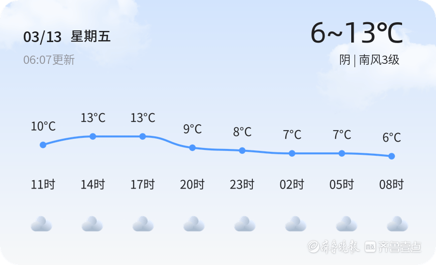 今天是3月13日,星期五,农历正月廿五。聊城地区今日天气以阴天为主,温度范围在6℃到13℃之间,南风3级,空气湿度较高,达77%。目前实时温度为7.2℃,PM2.5指数为138,空气质量处于轻度污染水平。各区天气状况基本一致,均为阴天,风力较小,适合市民外出活动。