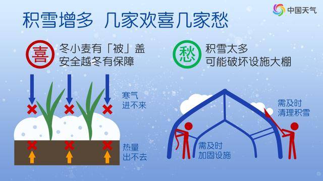 积雪可能导致农业设施和畜禽圈舍垮塌,建议相关地区的农民朋友提前加固蔬菜大棚、畜禽圈舍等设施,加盖防寒物,并及时清除棚舍积雪。