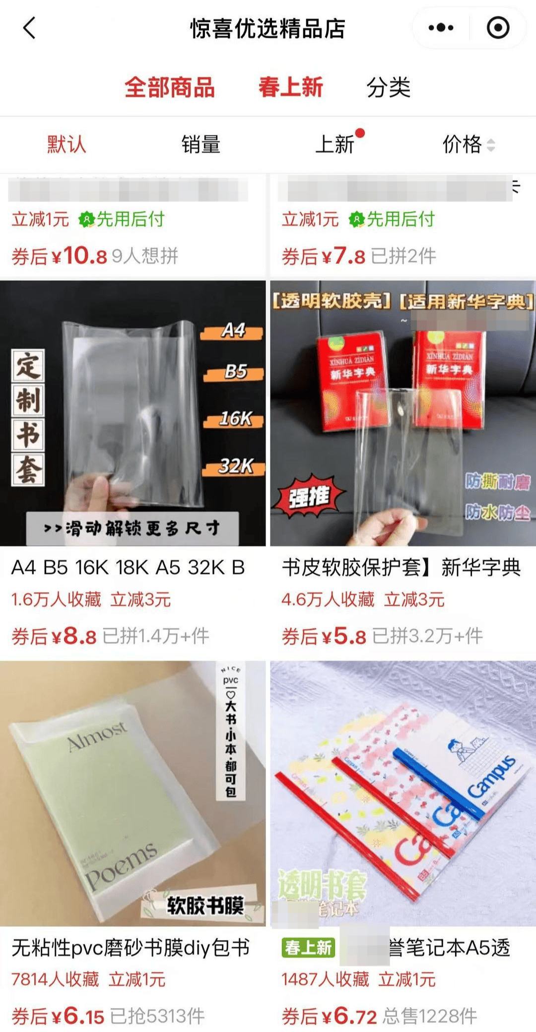 其中一家在拼多多平台上名为“惊喜优选精品店”的店铺,信息显示为个人开设,声明销售家庭手工业产品。记者看到,其所售的PVC书皮商品主页印有“活口书皮、PVC软胶书套”等字样,已拼近5000件,评论区部分消费者将书皮用于包装课外书籍、笔记本、日记本、儿童绘本等。客服在沟通中明确表示产品适用于小学课本,并称材料是“全新环保的,可以放心使用”。