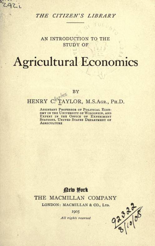 泰勒编写的这本《农业经济学研究导论》,取材广泛、论证翔实、通俗易懂,内容涵盖农业生产、经营、交易、分配等多个环节,涉及要素配置、农场管理、规模经营、财富分配、价值评估、土地经济、农产品贸易等众多主题,在学界开创了一个崭新而重要的学术领域。该教材一经发行,便引起了学术界的广泛关注,一时洛阳纸贵,于1909—1914年间重印四次。
