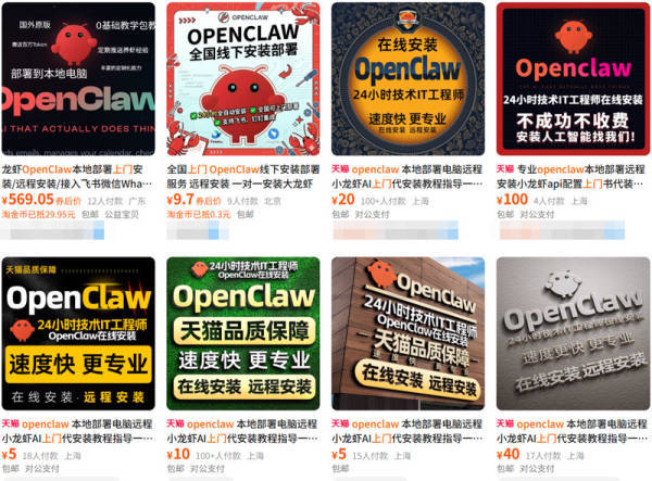 OpenClaw的相对高门槛带来了排他性,为服务行业的自然发展创造了机会。在电商平台上,简单搜索“OpenClaw”即可获得数百条商品,其中大多数是面向非技术用户的安装指南和技术支持包,价格在100至700元人民币之间。