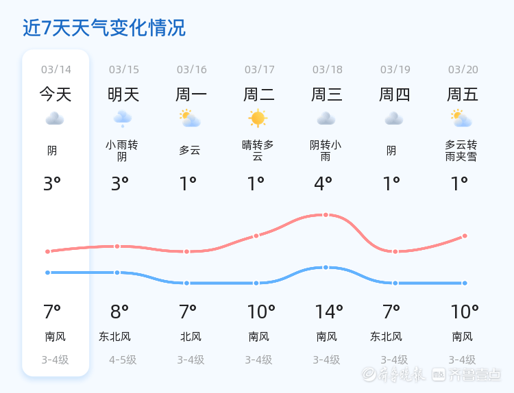今天是3月14日,星期六,农历正月廿六。烟台市迎来阴雨天气,气温在3℃到7℃之间,整体较为温和。全市各区均以阴转小雨天气为主,西南风1级,空气湿度为66%,PM2.5指数为90,空气质量良好。