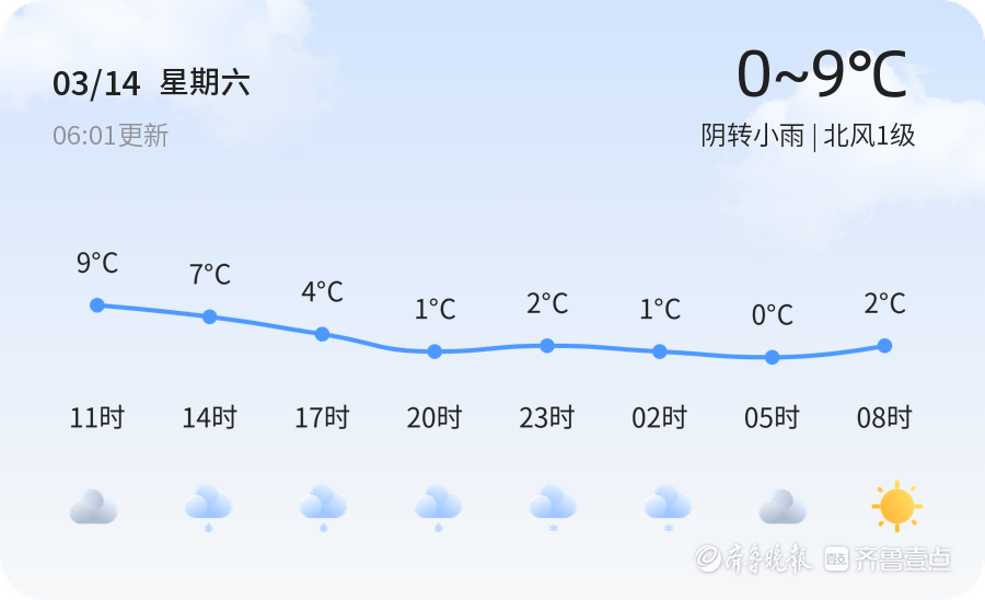今日是2026年3月14日,星期六,农历正月廿六。淄博市迎来阴转小雨天气,气温在0℃至9℃之间。目前北风1级,空气湿度65%,PM2.5指数为176,属于中度污染。市民出行时建议佩戴口罩,减少长时间户外活动。由于阴雨天气可能导致路面湿滑,市民应提前做好出行准备,携带雨具,减速慢行,确保安全。