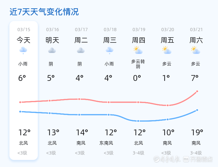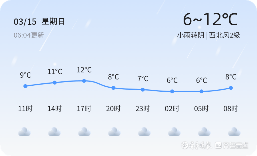 今日是3月15日,星期日,农历正月廿七。济宁市今日天气以小雨转阴为主,气温在6℃至12℃之间,目前实时气温为4.5℃,西北风2级,空气湿度较高,达到98%,PM2.5指数为64,空气质量良好。各区天气情况基本一致,均为小雨转阴,气温相差不大。
