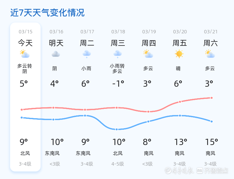 未来三天,日照市天气趋势总体平稳,但周三(3月17日)将迎来小雨天气,气温稍有下降,最低气温6℃,最高气温9℃。周三风力较大,北风4-5级,提醒市民注意防范大风和降雨对出行的影响。