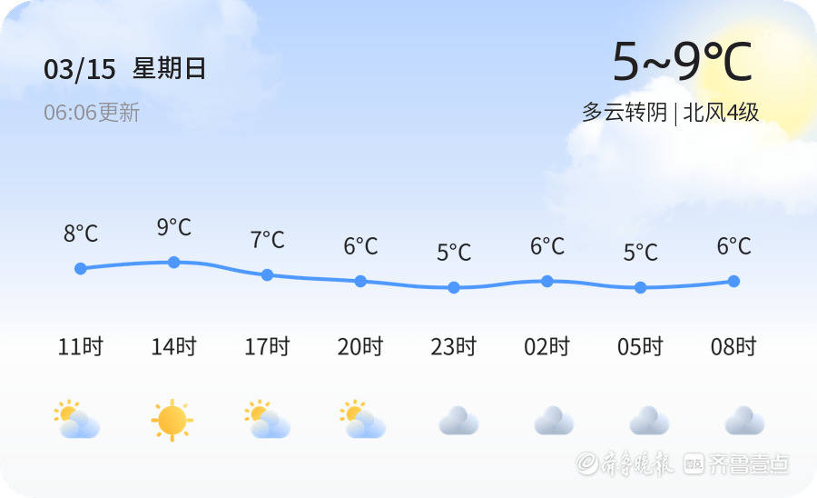 今天是3月15日,星期日,农历正月廿七。日照市今日天气多云转阴,气温在5℃至9℃之间,北风4级,空气湿度较高,达到88%。各区天气情况基本一致,整体以多云到阴为主,风力适中。