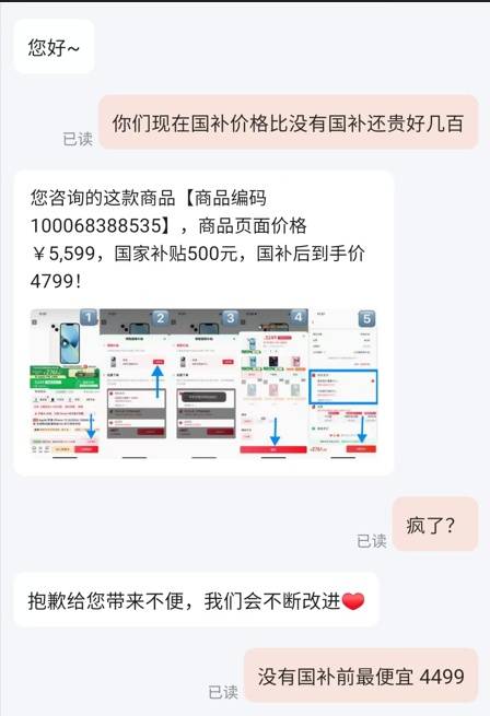 于先生告诉记者:“晚上调价后的原价为5599元(‘国补’后4799元),这个价格不仅比白天刚上线时高,甚至比‘国补’上线前还贵了300元。”