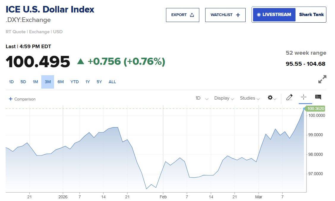 在国际油价上行的同时,美元也在加速上涨。3月13日,美元指数突破100关口,为去年11月以来首次。