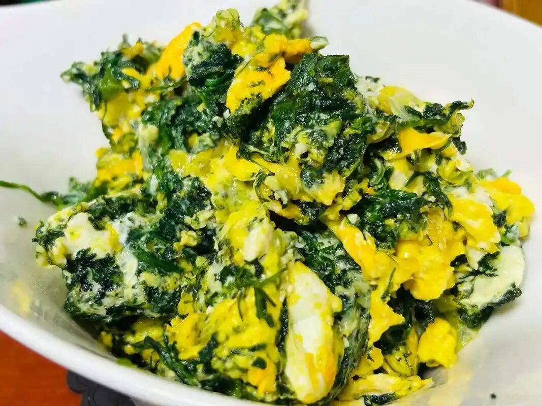 荠菜鲜,清洗、切切,下锅超软,磕上几个笨鸡蛋,用铲子给鸡蛋打散,如此在高温下,鸡蛋定型,bu住了荠菜,鲜上加鲜。