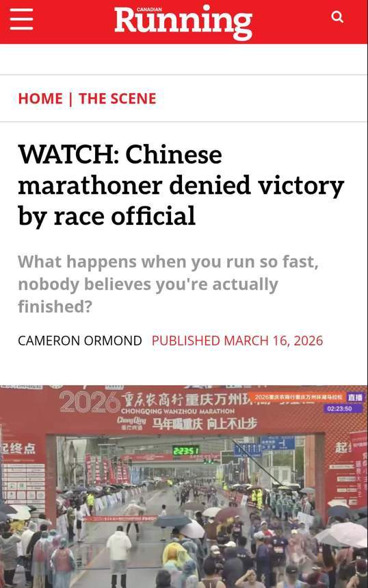 北美《跑步杂志》以《中国马拉松选手被赛事裁判剥夺胜利》为题撰文:“当你跑得太快,快到没人相信你真的跑完了,会发生什么?比赛里,冲线照片重拍的机会微乎其微,但永远不是零。在中国重庆举行的万州马拉松周日赛事中,男子组冠军盛雪李就被要求这么做了。”