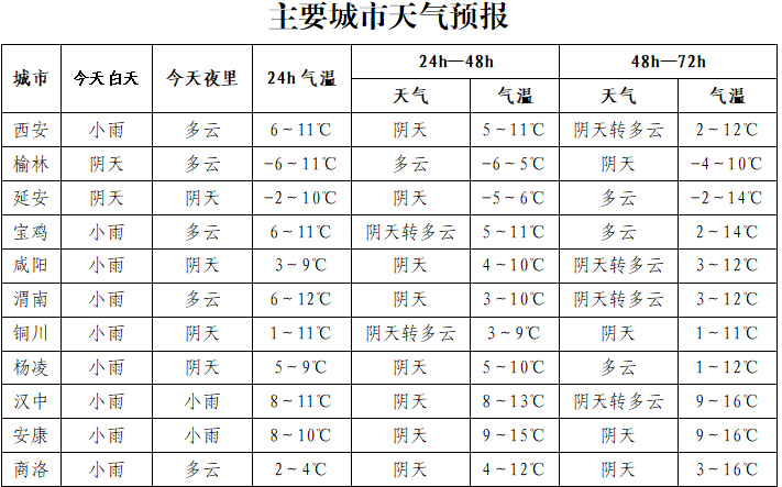 19日:全省阴天转多云。关中北部有分散性小雨或雨夹雪(0~0.5毫米),局地有小雪(0~1毫米);陕南南部局地有分散性小雨(0~1毫米)。