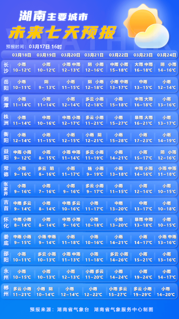 3月18日白天,湘北小雨转多云,其他地区阴天有小到中雨,其中怀化中部局地大雨,18日清晨湘北局地有雾;北风3~4级,局地阵风7级;最低气温湘南11~14℃,其他地区7~10℃;最高气温湘南19~21℃,其他地区14~18℃。